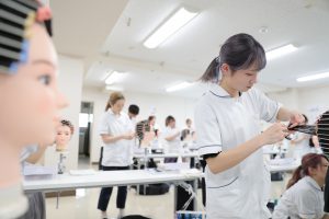 今回のテーマは“キレイにまいてみよう♪”1人1台ウィッグを使ってワインディング(パーマの技術)の体験ができます。もちろん、入試や学費の説明も行います。