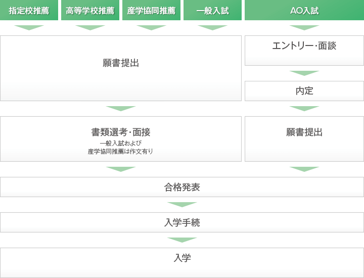 | 入試区分 | 指定校推薦 | 高等学校推薦 | 産学協同推薦 | 一般入試 | AO入試 |